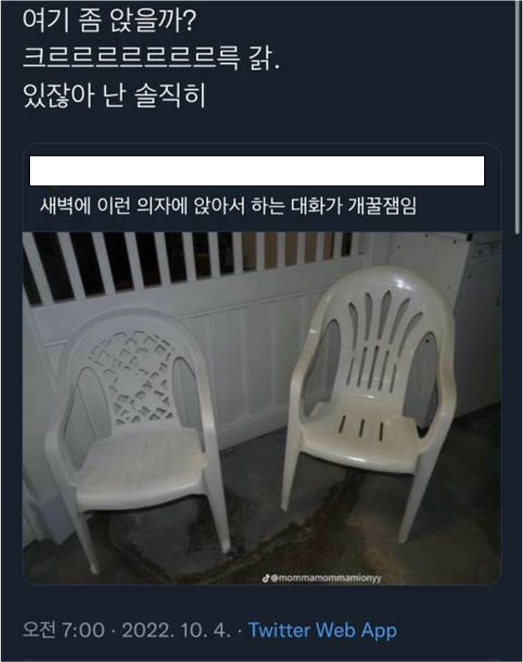 而其中一名轉發者提到了「要在這裡坐一下嗎?(椅子拉動聲) 話說...我其實...」,這則貼文在網路上掀起了熱潮,而後演變成了現在的流行語「그르르갉」,還出現了「그르르갉 갈래? 」、「우리 이따 그르르갉 어때?」這類問對方想不想去便利商店聊聊的用法~