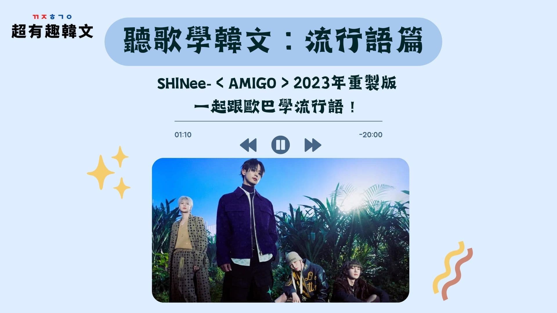 除了看韓綜、韓劇學韓文,我們還能利用韓文歌來學習,像今天我們要為大家介紹的就是SHINee在《文明特急》裡重唱2023年版本的AMIGO,重製版裡面可是滿滿的流行語,每一個都是韓國人日常會用到的,今天就學起來讓你的韓國朋友嚇一跳吧!趕快來聽歐巴唱歌囉~